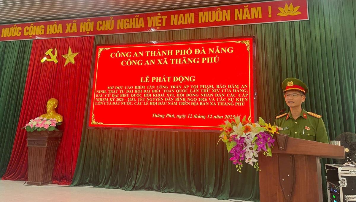 Sáng 12-12, Công an các xã: Tam Xuân, Quế Sơn, Thăng Phú (TP Đà Nẵng) ra quân thực hiện cao điểm tấn công, trấn áp tội phạm, bảo đảm an ninh trật tự (ANTT) Đại hội đại biểu toàn quốc lần thứ 14 của Đảng, bầu cử đại biểu Quốc hội khóa 16, HĐND các cấp nhiệm kỳ 2026 - 2031, Tết Nguyên đán Bính Ngọ 2026 và các sự kiện chính trị, Lễ hội đầu năm trên địa bàn.
