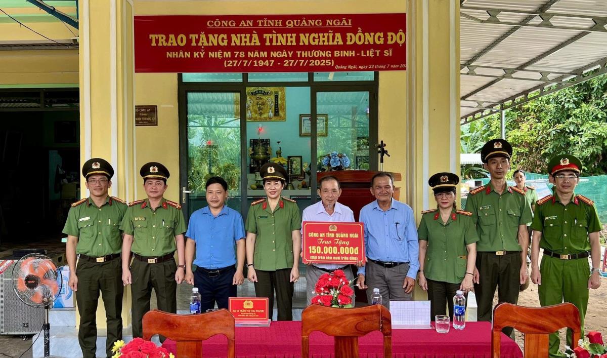 Cũng trong dịp này, Công an tỉnh Quảng Ngãi phối hợp với chính quyền xã Đình Cương (Quảng Ngãi) bàn giao 1 căn nhà tình nghĩa đồng đội trị giá 150 triệu đồng cho ông Phạm Phú Giới (trú thôn Thuận Hòa, xã Đình Cương), là thương binh CAND, nguyên cán bộ Công an thị xã Quảng Ngãi. Tại Lễ bàn giao nhà, Đại tá Trần Thị Thu Phước - Phó Bí thư Đảng ủy, Phó Giám đốc Công an tỉnh Quảng Ngãi chúc mừng gia đình ông Phạm Phú Giới, đồng thời tin tưởng, với tinh thần trách nhiệm và lòng nhiệt huyết, đồng chí Phạm Phú Giới tiếp tục có những đóng góp tích cực vào nhiệm vụ bảo đảm an ninh trật tự tại địa phương.