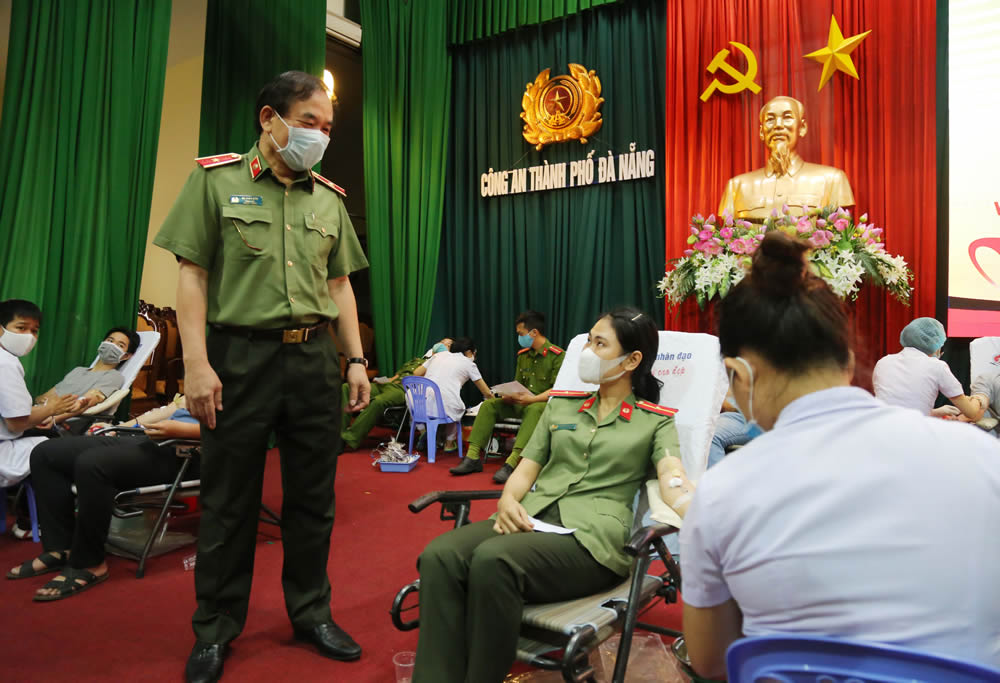 Thiếu tướng Vũ Xuân Viên – Giám đốc CATP Đà Nẵng động viên CBCS tham gia hiến máu. |
