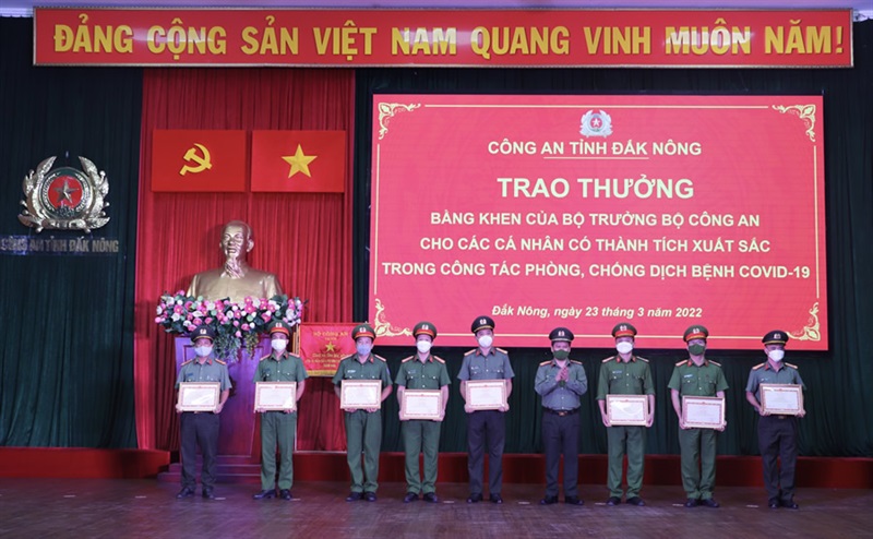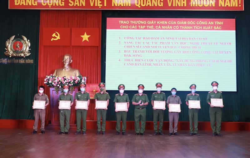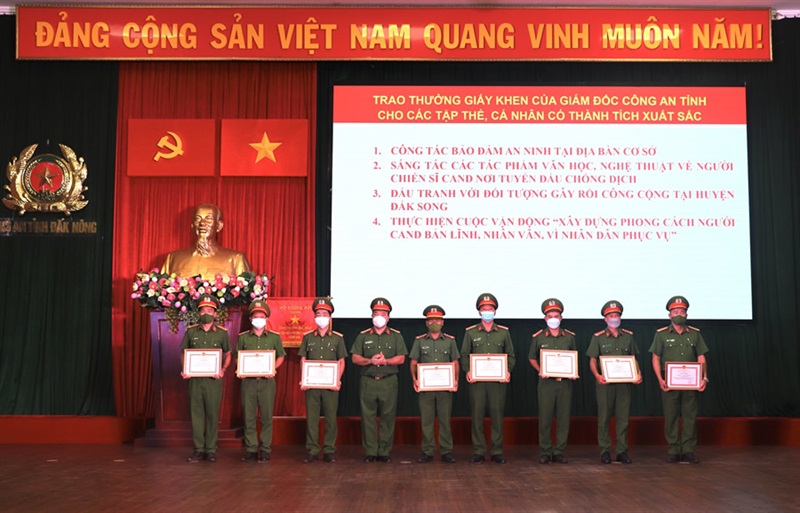 Nhân dịp này, Công an tỉnh Đắk Nông đã trao trao quyết định của Bộ trưởng Bộ Công an về việc khen thưởng đối với các đơn vị thuộc Công an tỉnh Đắk Nông về thành tích xuất sắc trong đấu tranh, phòng chống tội phạm; trao bằng khen của Bộ Công an và giấy khen của Giám đốc Công an tỉnh cho các tập thể, cá nhân có thành tích xuất sắc trong các mặt công tác.
