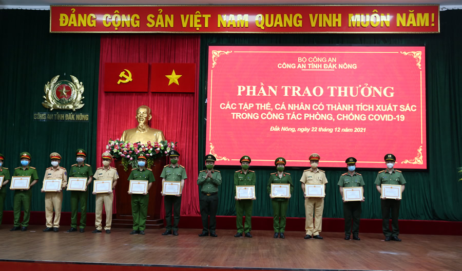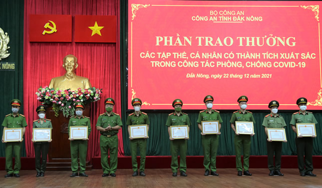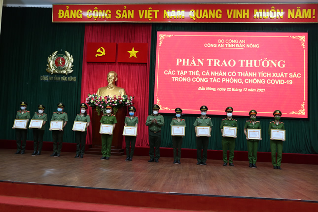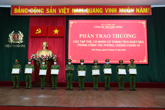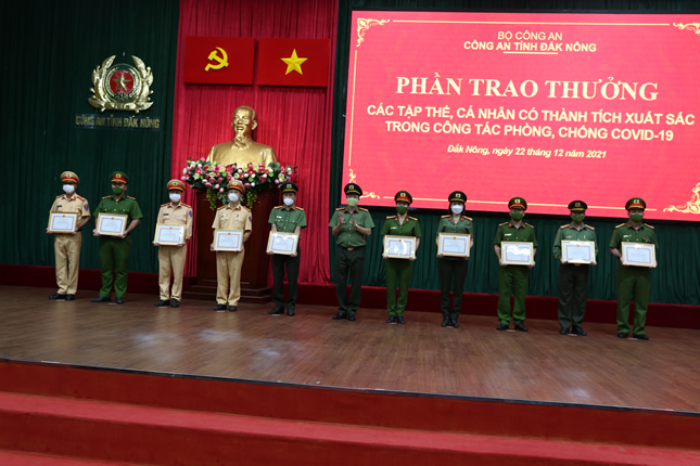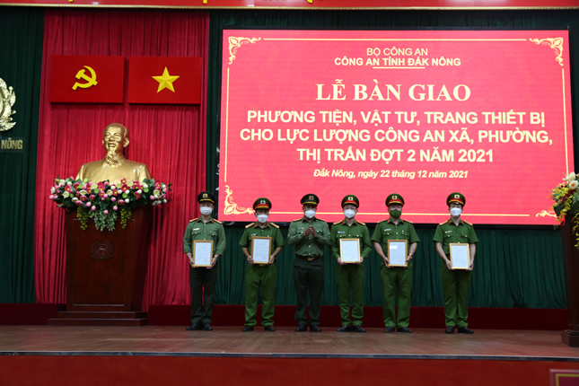 Nhân dịp này, Công an tỉnh Đắk Nông đã khen thưởng cho các tập thể và cá nhân có thành tích xuất sắc trong công tác phòng, chống dịch Covid – 19 và bàn giao phương tiện, vật tư, trang thiết bị cho lực lượng Công an xã trên địa bàn toàn tỉnh đợt 2 năm 2021.