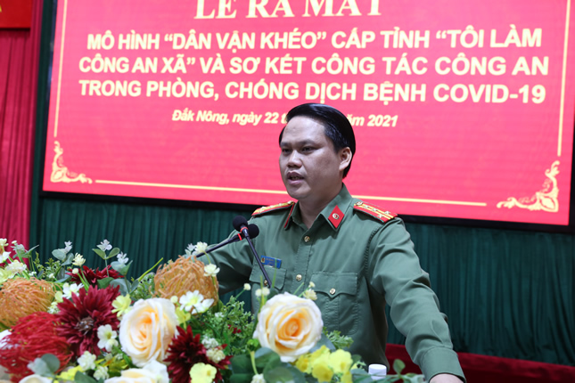 Thực hiện chủ trương “Bám cơ sở” và căn cứ kết quả bước đầu sau gần 1 năm thực hiện Kế hoạch tăng cường cán bô, chiến sĩ (CBCS) các đơn vị cấp phòng thực hiện nhiệm vụ tại Công an xã gọi tắt Kế hoạch “Tôi làm Công an xã” và chương trình tuyên truyền, phát động điểm phong trào toàn dân bảo vệ ANTQ gắn với công tác dân vận, xã hội tình nghĩa tại các địa bàn trọng điểm, phức tạp về ANTT, Công an tỉnh Đắk Nông đã triển khai xây dựng Kế hoạch “Tôi làm Công an xã” thành mô hình “Dân vận khéo” cấp tỉnh đầu tiên ở Đắk Nông với 3 mục tiêu: tổ chức cho toàn thể cán bộ, chiến sĩ Công an tỉnh bám cơ sở - vì Nhân dân phục vụ, nâng cao hiệu quả công tác dân vận, xây dựng và củng cố phong trào toàn dân bảo vệ ANTQ, góp phần bảo đảm an ninh, trật tự ở cơ sở. Tăng cường, bổ sung lực lượng cho Công an xã, nâng cao hiệu quả chất lượng công tác bảo đảm an ninh, trật tự ở cơ sở; trực tiếp hướng dẫn chuyên môn nghiệp vụ đối với Công an xã… Tổ chức rèn luyện, nâng cao đạo đức, ý thức tổ chức kỷ luật, tinh thần trách nhiệm của cán bộ chiến, xây dựng tác phong làm việc chính quy…Tổng số cán bộ, chiến sĩ tham gia mô hình là hơn 2.000 người. Thời gian thực hiện mô hình từ năm 2021 – 2023. Sau đó tiến hành tổng kết, đề xuất kế hoạch trong giai đoạn tiếp theo.