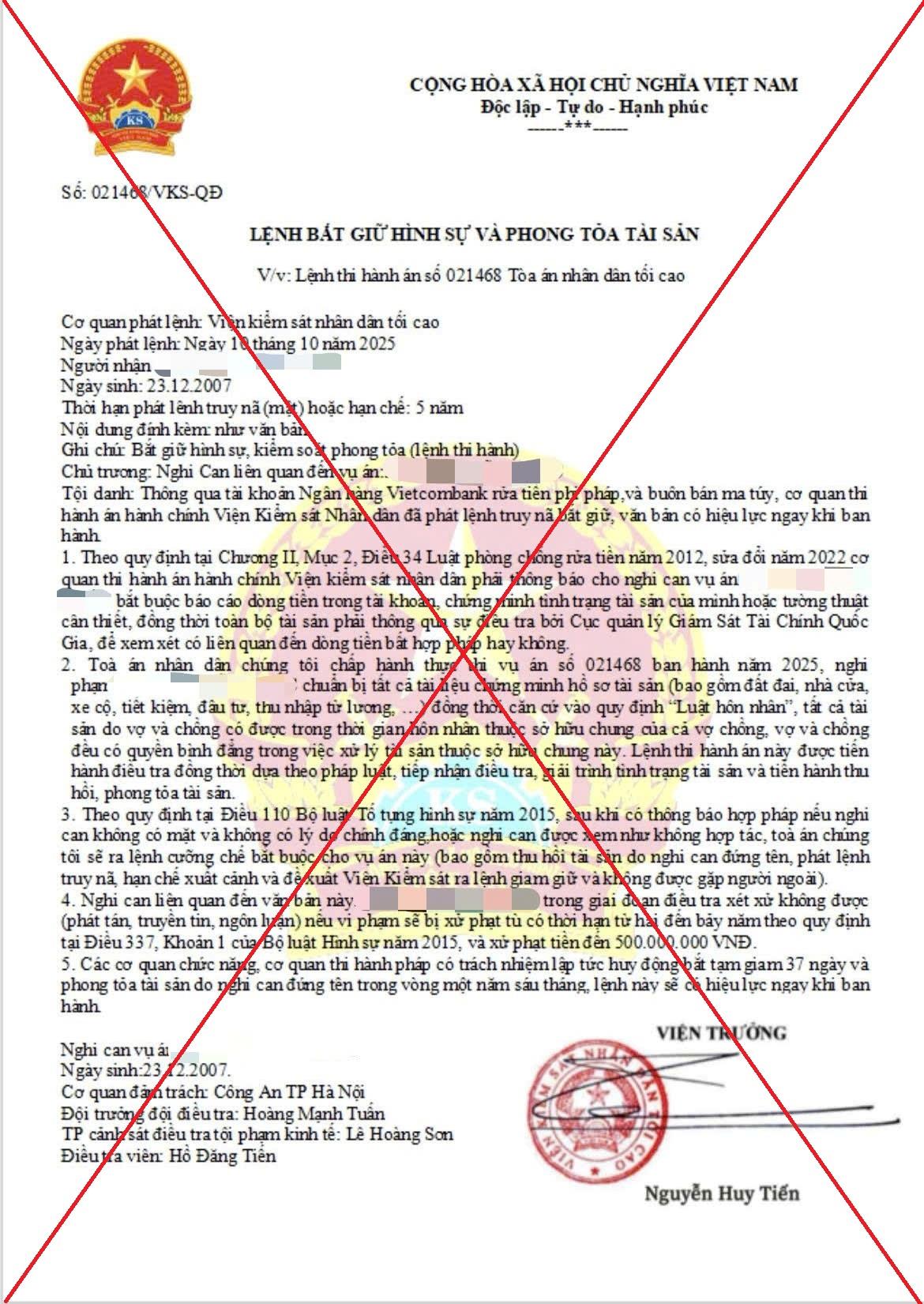 Đây là thủ đoạn lừa đảo tinh vi khi các đối tượng mạo danh các cơ quan như Công an, Viện kiểm sát, Tòa án, gọi điện đe dọa về việc nạn nhân có liên quan đến tội phạm ma túy, rửa tiền, buộc phải làm theo “hướng dẫn” nếu không sẽ bị bắt giữ… Từ đó, các đối tượng khống chế, yêu cầu chuyển tiền vào tài khoản để chiếm đoạt tài sản, gây hoang mang, lo lắng cho nhiều gia đình.