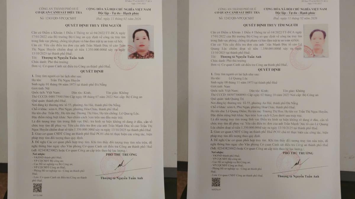 Hai người bị truy tìm gồm Trần Thị Ngọc Huyền (SN 1975) và chồng là Lê Quang Lộc (SN 1973). Theo hồ sơ, cả hai có hộ khẩu thường trú tại tổ 55, phường An Hải, TP Đà Nẵng; đồng thời có nơi ở khác tại xóm 6, Phú Ngạn, phường Hóa Châu, TP Huế.