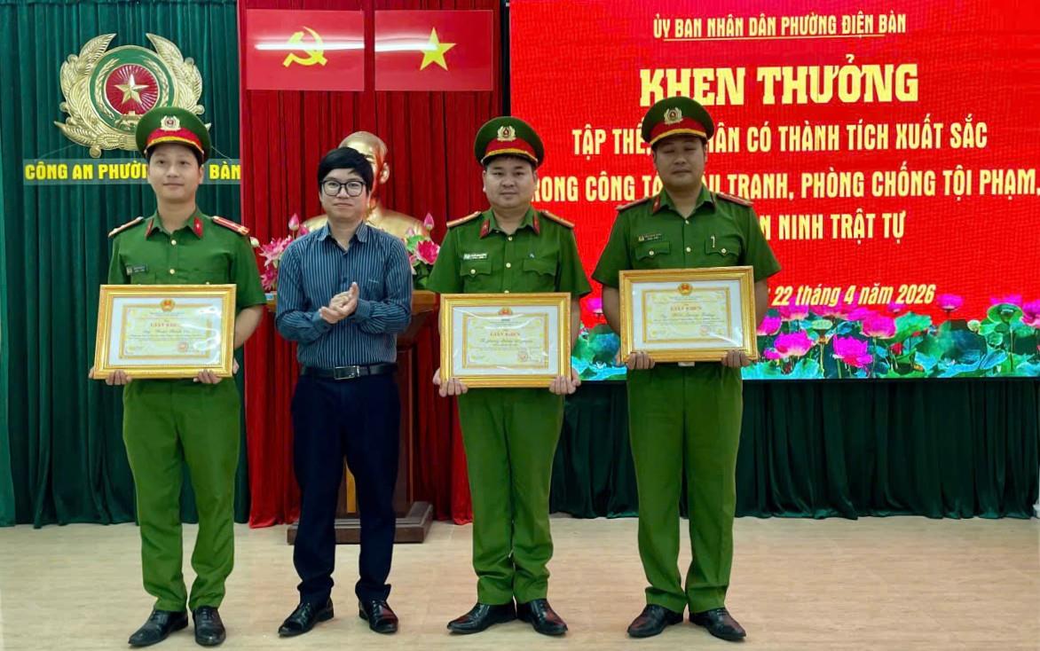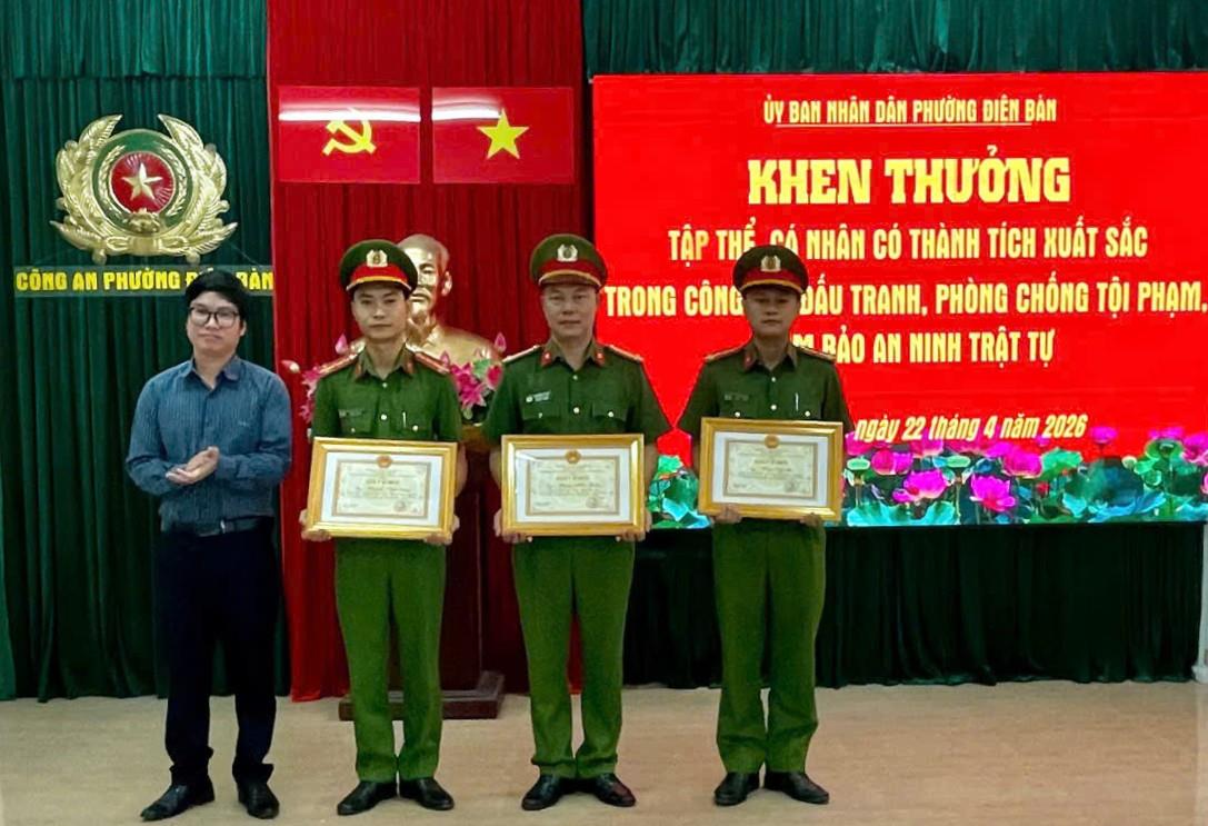 Sáng 22-4, UBND phường Điện Bàn (TP Đà Nẵng) tổ chức khen thưởng đột xuất nhằm biểu dương các tập thể, cá nhân thuộc Công an phường đã có thành tích xuất sắc trong công tác đấu tranh phòng, chống tội phạm và bảo đảm an ninh, trật tự trên địa bàn.