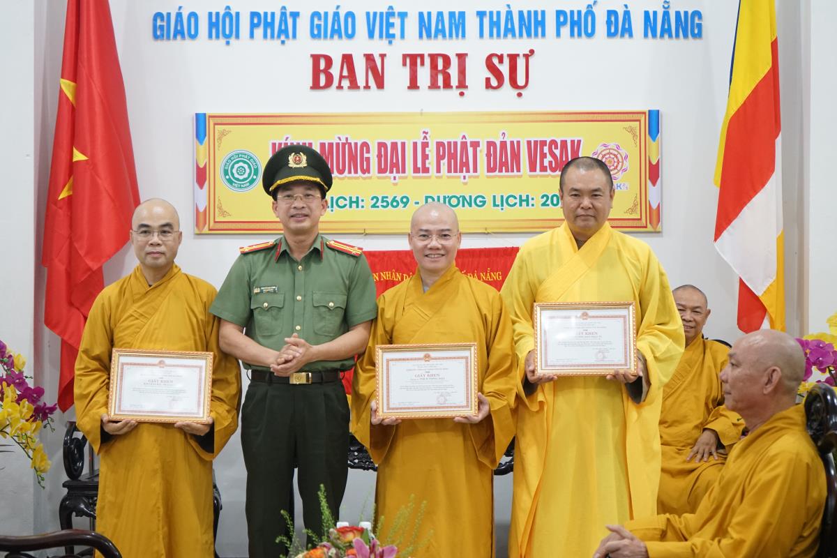 Dịp này, CATP Đà Nẵng đã trao tặng Giấy khen cho tập thể Ban Giáo dục Phật giáo, Ban Hướng dẫn phật tử và cá nhân Thượng tọa Thích Thông Đạo - UV HĐTS, Phó Trưởng ban Thường trực BTS GHPGVN TP Đà Nẵng đã có thành tích trong việc triển khai mô hình “Phối hợp tuyên truyền, phổ biến, giáo dục pháp luật trong Ban Trị sự Phật giáo thành phố”.