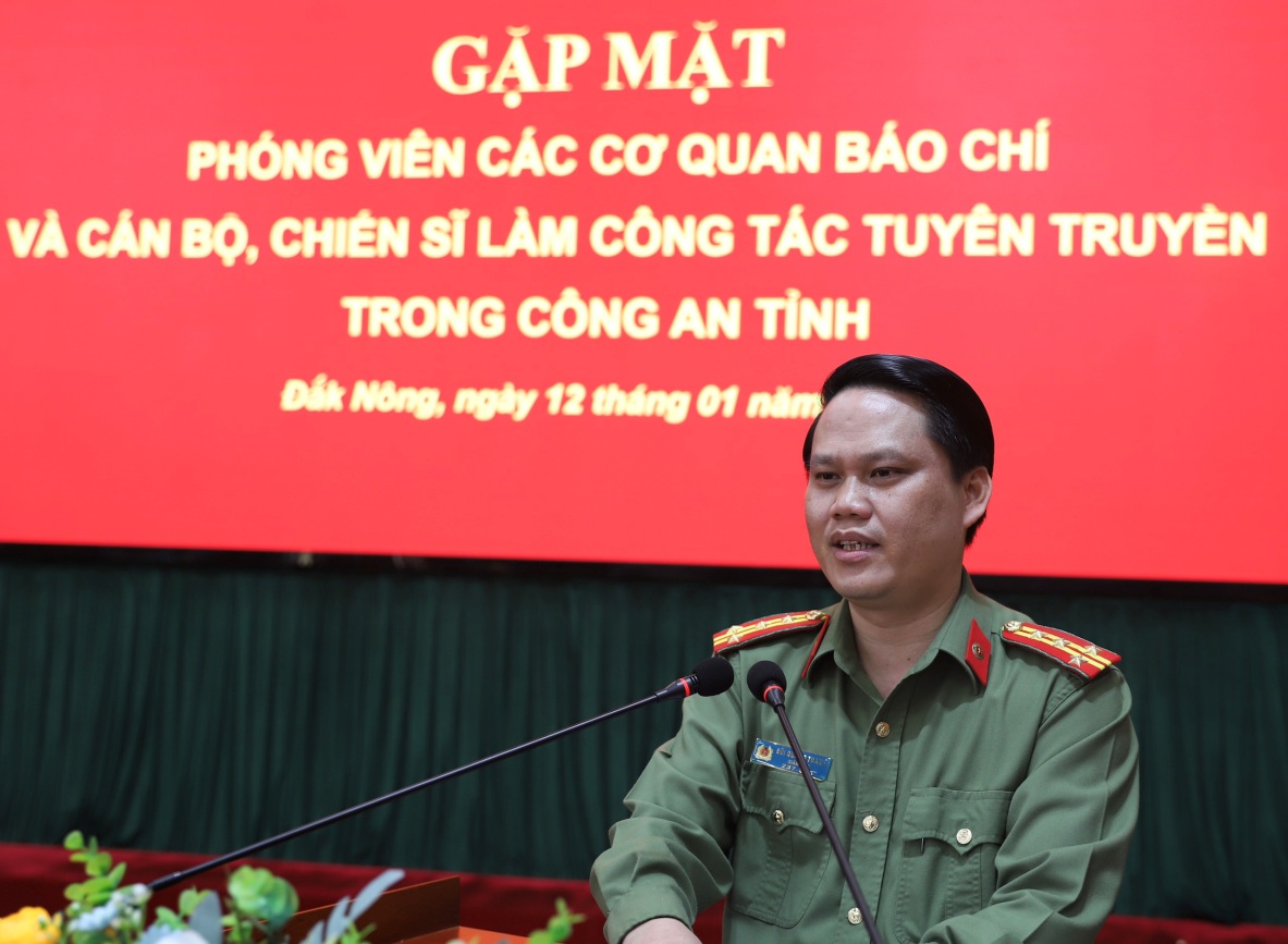 Thay mặt Đảng ủy, lãnh đạo Công an tỉnh, Đại tá Bùi Quang Thanh, Giám đốc Công an tỉnh đã gửi lời chúc mừng năm mới và ghi nhận, đánh giá cao, cảm ơn những đóng góp quan trọng của đội ngũ những người làm báo, các cơ quan báo chí đã luôn đồng hành, gắn bó với lực lượng Công an tỉnh trong thời gian qua. Đồng chí Giám đốc Công an tỉnh mong muốn các cơ quan quản lý, phóng viên báo chí tiếp tục quan tâm, đồng hành, phối hợp tốt hơn nữa với lực lượng Công an tỉnh trong công tác tuyên truyền, góp phần phòng ngừa, nâng cao cảnh giác cho người dân về âm mưu, phương thức thủ đoạn của các thế lực thù địch và tội phạm; tích cực tham gia phong trào toàn dân bảo vệ ANTQ, phát hiện tố giác tội phạm và lan tỏa những thành tích, chiến công, những hình ảnh đẹp, việc làm ý nghĩa, nhân văn của lực lượng Công an Đắk Nông trên các phương tiện thông tin đại chúng...