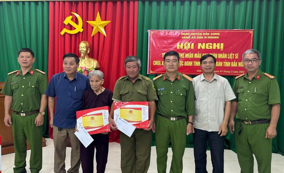 Ngày 7 và 8/5, Công an tỉnh Đắk Nông phối hợp với đoàn công tác Cục Cảnh sát Quản lý hành chính về trật tự xã hội, Bộ Công an, Công ty Genestory (đơn vị xét nghiệm) và chính quyền địa phương tiến hành thu thập mẫu ADN thân nhân liệt sĩ chưa xác định được danh tính trên địa bàn tỉnh. Việc triển khai thu nhận mẫu ADN thân nhân liệt sĩ chưa xác định được danh tính do Công an tỉnh Đắk Nông chủ trì, phối hợp với các đơn vị chức năng tổ chức là bước chuẩn bị tốt nhất cho hành trình tìm kiếm, giúp mở ra cơ hội để các gia đình có điều kiện sớm tìm thấy thi hài liệt sĩ, qua đó quy tập, đưa các anh hùng liệt sĩ trở về với gia đình.