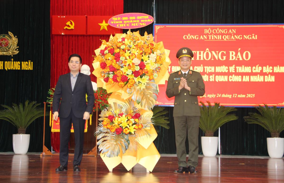 Thượng tướng Lê Văn Tuyến, Chủ tịch UBND tỉnh Quảng Ngãi Nguyễn Hoàng Giang và Ban Giám đốc Công an tỉnh tặng hoa chúc mừng Giám đốc Công an tỉnh được thăng hàm thiếu tướng.