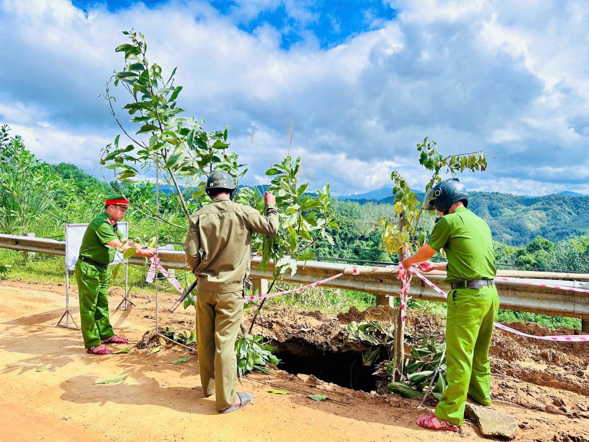Trong quá trình thực hiện, lực lượng Công an xã phát hiện một số đoạn đường sụt lún nghiêm trọng tạo “hố tử thần” sâu, gây nguy hiểm trực tiếp cho người tham gia giao thông. Ngay lập tức, các đoàn viên đã phối hợp với các đơn vị quản lý đường bộ khoanh vùng nguy hiểm, giăng dây, dựng biển cảnh báo, ngăn ngừa rủi ro tai nạn.