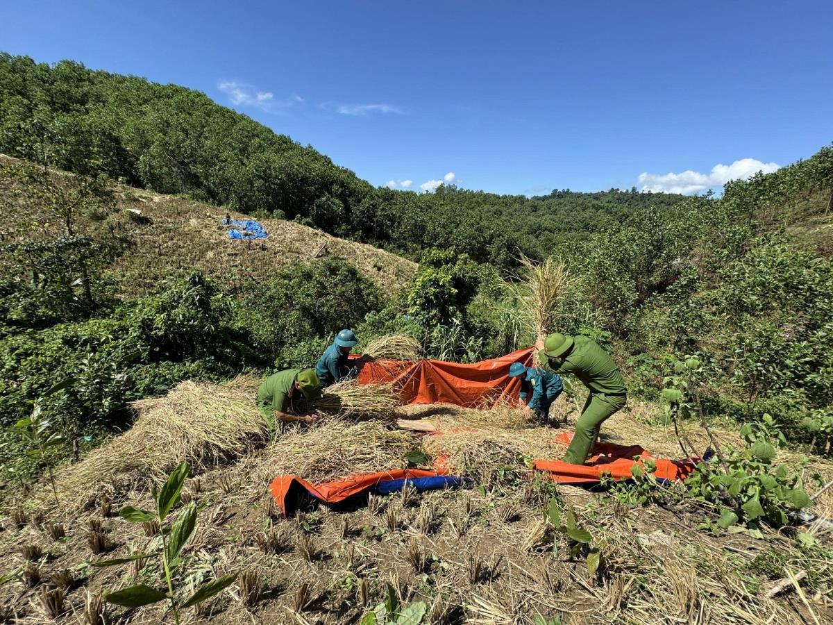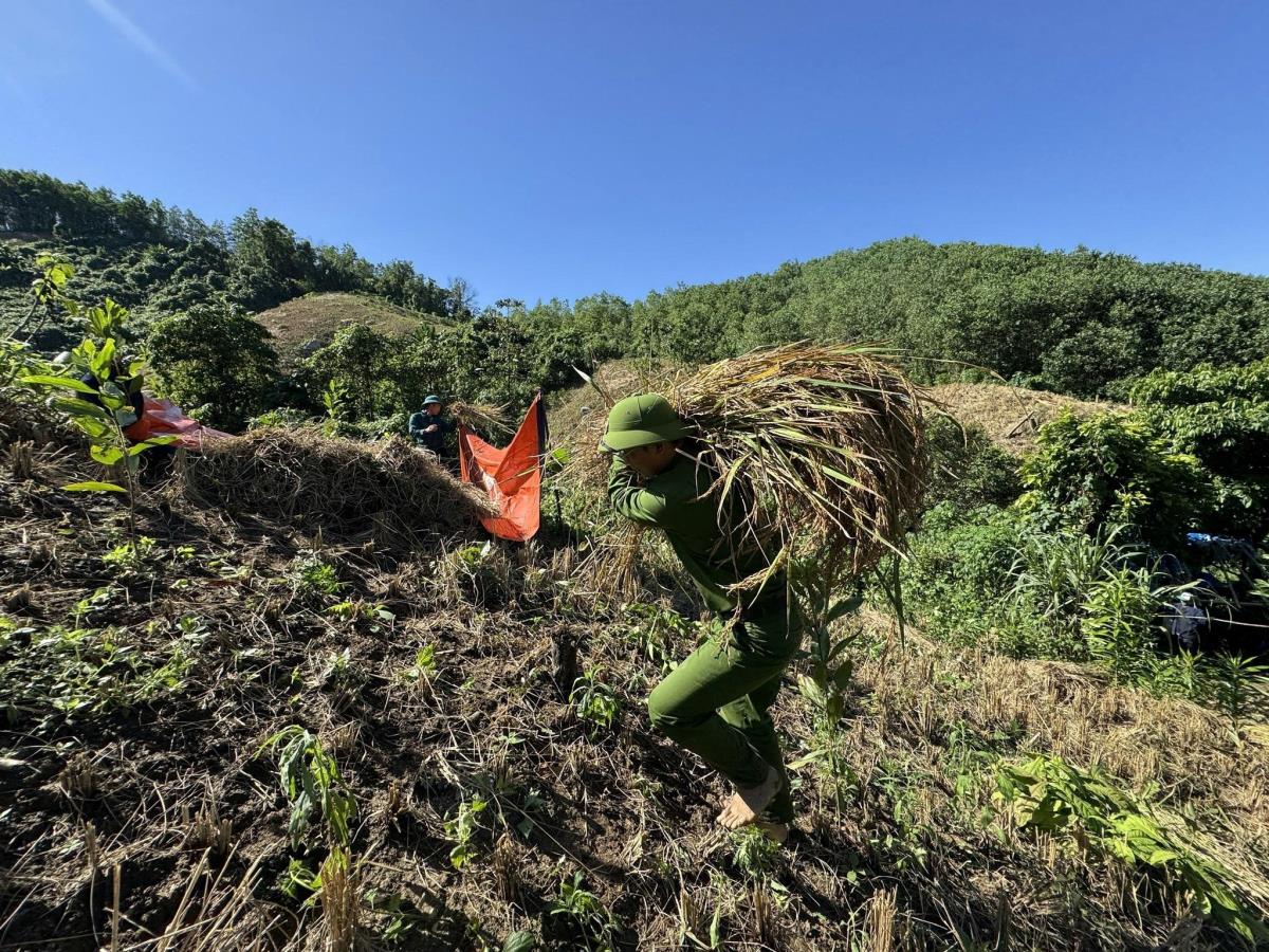 Mặc dù thời tiết nắng nóng, địa hình đồi dốc và đường đi lại khó khăn, nhưng cán bộ, chiến sĩ vẫn không quản ngại vất vả, khẩn trương gặt, đập và vận chuyển lúa giúp gia đình anh Trúc. Chỉ trong một ngày, toàn bộ hơn 3 sào lúa rẫy của gia đình đã được thu hoạch hoàn thành, hạn chế tối đa thiệt hại do mưa, bão, lũ lụt gây ra.