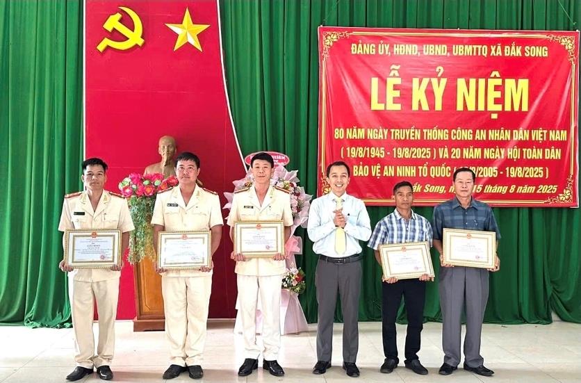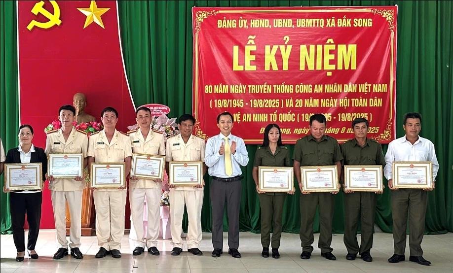 Chiều ngày 15/8, Đảng ủy, HĐND, UBND, UBMTTQ.VN xã Đắk Song, tỉnh Lâm Đồng đã long trọng tổ chức lễ kỷ niệm 80 năm Ngày truyền thống Công an nhân dân (19/8/1945-19/8/2025) và 20 năm Ngày hội toàn dân bảo vệ an ninh Tổ quốc (19/8/2005-19/8/2025). Tham dự lễ kỷ niệm có lãnh đạo Đảng ủy, HĐND, UBND, UBMTTQ.VN xã; lãnh đạo các ban, ngành, đoàn thể; Bí thư, thôn trưởng các thôn, bon; cán bộ, chiến sĩ Công an và lực lượng tham gia Bảo vệ an ninh trật tự ở cơ sở...
