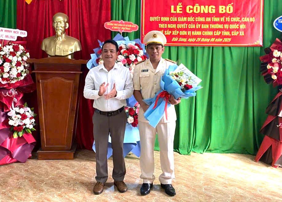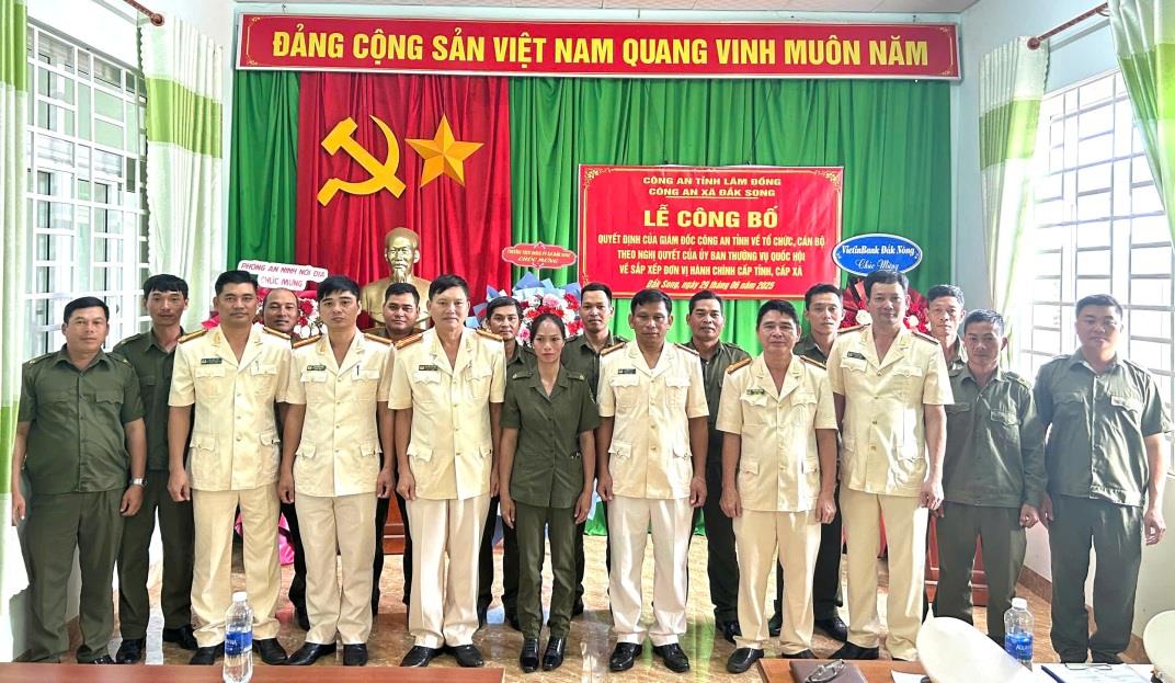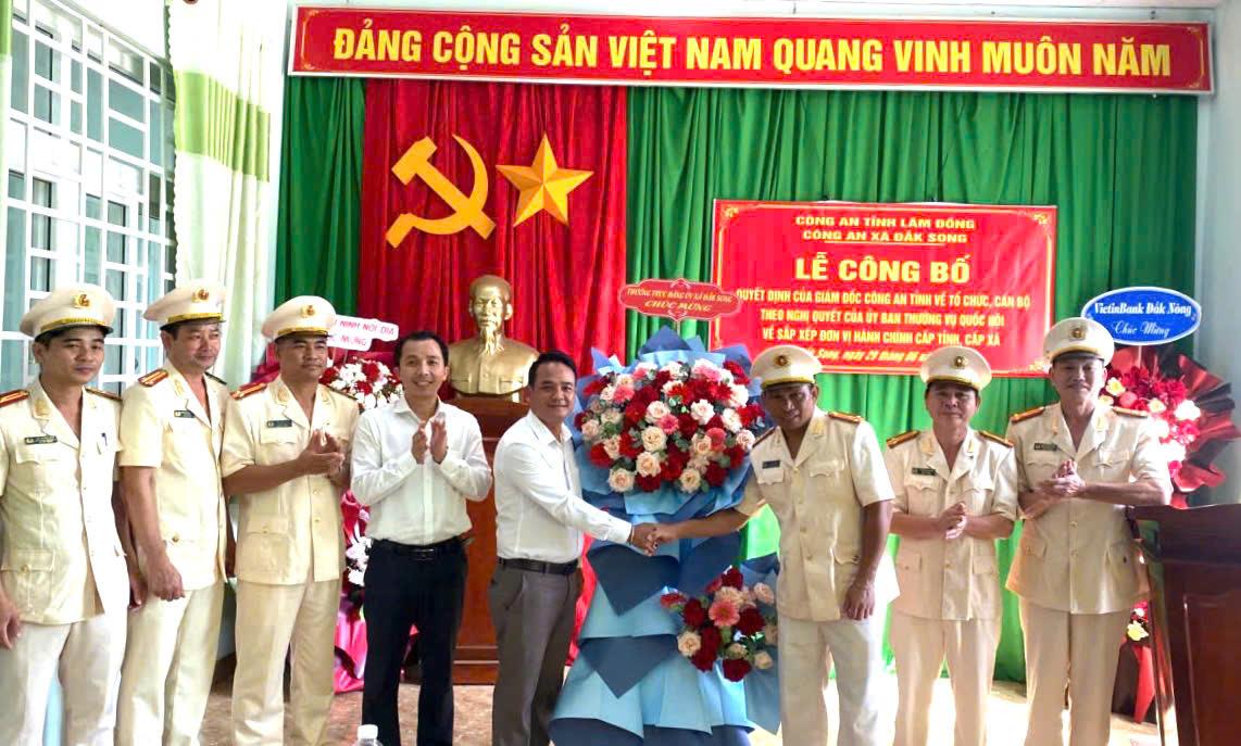Chiều 29/6, Công an xã Đắk Song, tỉnh Lâm Đồng đã tổ chức Lễ công bố quyết định của Giám đốc Công an tỉnh về tổ chức, cán bộ theo Nghị quyết của Ủy ban Thường vụ Quốc hội về sắp xếp đơn vị hành chính cấp xã dưới sự chủ trì của Thượng tá Y Bhim Kễn, Trưởng Công an xã. Dự và chỉ đạo buổi lễ có đồng chí Niê Sơ Nghiêm, Phó Bí thư thường trực Đảng ủy xã và đồng chí Mai Trần Anh, Phó Chủ tịch UBND xã Đắk Song.