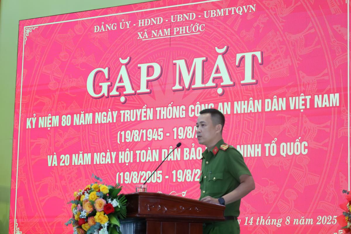 Tại buổi gặp mặt, Trung tá Phạm Văn Hiệp – Trưởng Công an xã Nam Phước đã ôn lại chặng đường vẻ vang của lực lượng CAND qua 80 năm xây dựng và trưởng thành. Cùng với truyền thống 80 năm xây dựng, chiến đấu và trưởng thành của lực lượng CAND nói chung, lực lượng Công an xã Nam Phước – trước đây là Công an xã Duy Vinh, Công an xã Duy Phước và Công an thị trấn Nam Phước nói riêng trải qua nhiều giai đoạn lịch sử, dù trong bất kỳ hoàn cảnh nào CBCS Công an xã cũng luôn kiên định mục tiêu, lý tưởng cách mạnh, phát huy truyền thống, mưu trí, dũng cảm, sẵn sàng chiến đấu hi sinh vì ANTQ, vì hạnh phúc nhân dân.