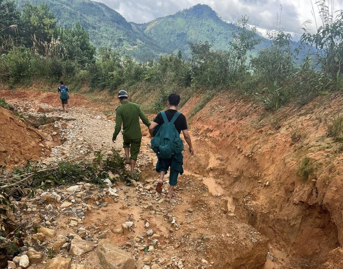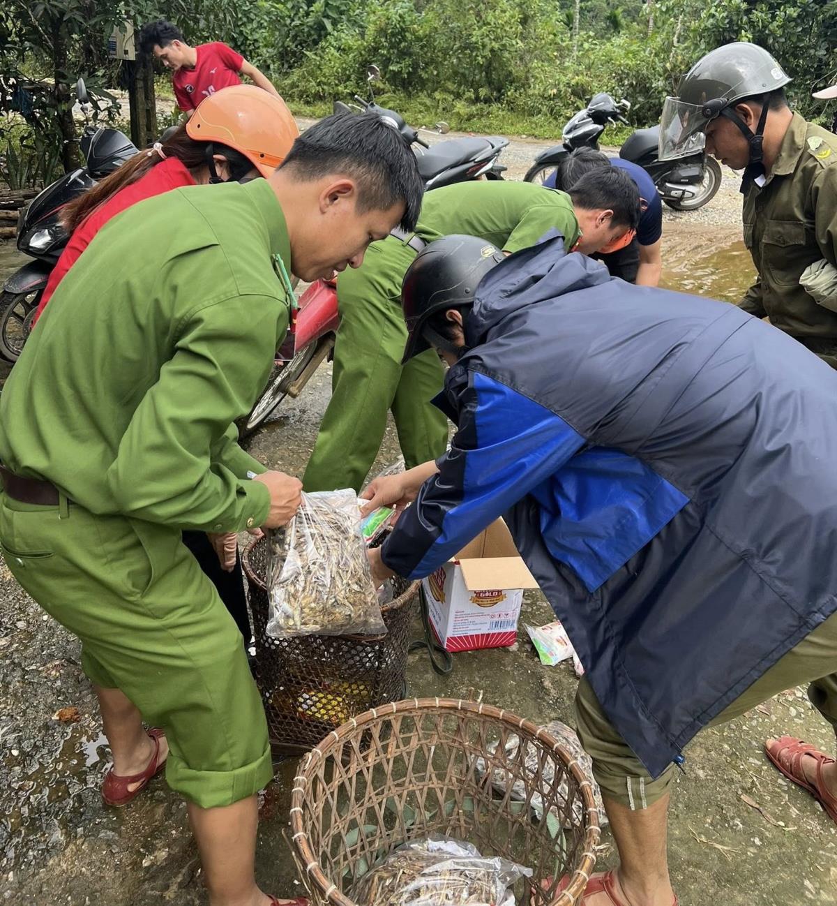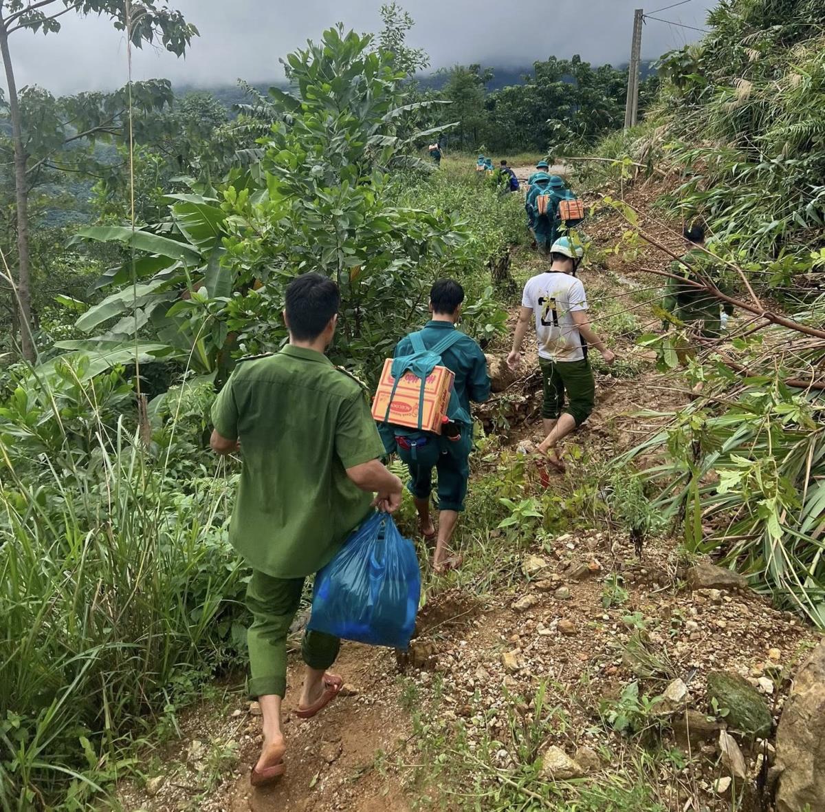 Để mang được những phần quà thiết yếu đến cho bà con, cán bộ, chiến sĩ Công an xã phải vượt quãng đường gần 30 km với địa hình đồi núi, nhiều đoạn bị sạt lở nghiêm trọng, phải đi bộ liên tục hơn 4 tiếng đồng hồ, băng qua suối sâu, dốc cao, đường lầy lội, trơn trượt.