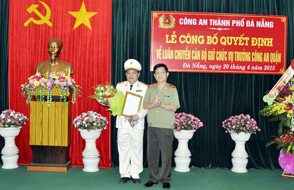 | Thiếu tướng Nguyễn Văn Sơn- Giám đốc CATP- trao quyết định luân chuyển cán bộ giữ chức Trưởng CAQ Liên Chiểu cho Đại tá Nguyễn Văn Hoa. |