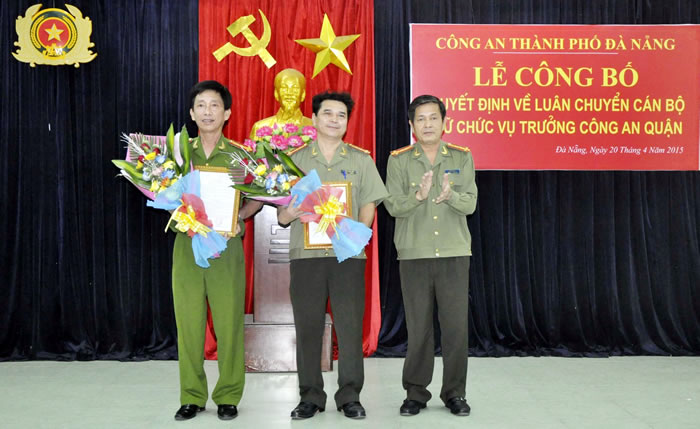 (Cadn.com.vn) - Ngày 20-4, lãnh đạo CATP đã tổ chức lễ công bố quyết định luân chuyển Trưởng CA 3 quận trên địa bàn TP. Theo đó, Đại tá Nguyễn Văn Hoa - Trưởng phòng CSĐTTPVMT được luân chuyển đến nhận chức vụ Trưởng CAQ Liên Chiểu; Đại tá Trần Phước Hương - Trưởng phòng Tham mưu được luân chuyển đến nhận chức vụ Trưởng CAQ Hải Châu; Đại tá Nguyễn Thanh Tùng - Trưởng phòng An ninh xã hội đến nhận chức vụ Trưởng CAQ Ngũ Hành Sơn; Đại tá Phạm Nhi Tùng - Trưởng CAQ Ngũ Hành Sơn nhận chức vụ Trưởng phòng An ninh xã hội.
