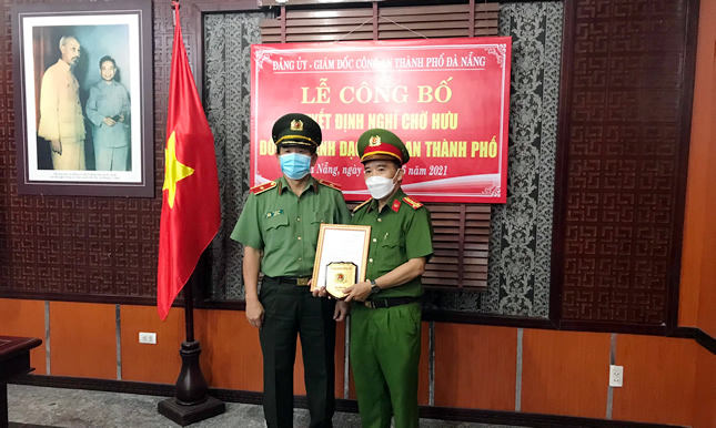 Thiếu tướng Vũ Xuân Viên, Giám đốc CATP Đà Nẵng trao quyết định nghỉ công tác chờ hưởng chế độ hưu trí cho Đại tá Lê Quốc Dân. |