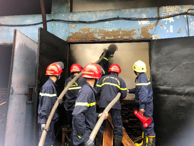Lực lượng PCCC triển khai lực lượng dập tắt vụ cháy tại một xưởng sản xuất gỗ trên địa bàn Q.Cẩm Lệ. |