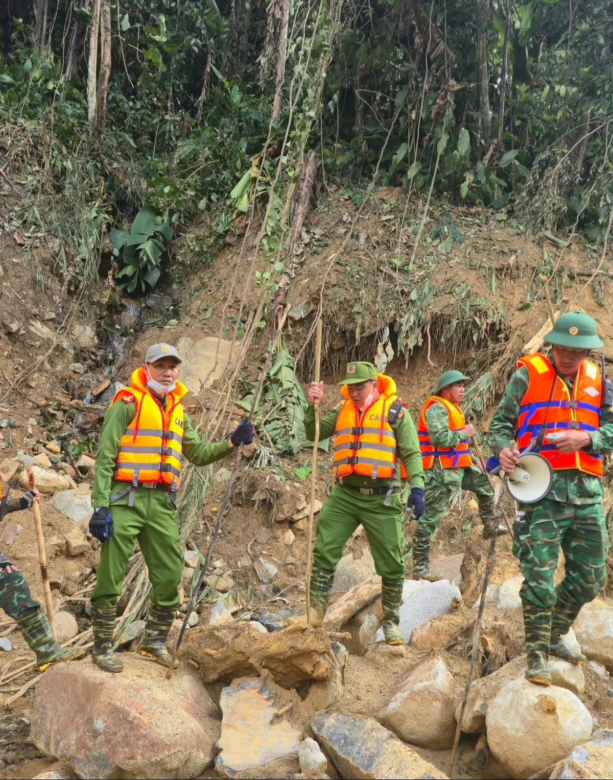 Các lực lượng chức năng vẫn quyết tâm vượt qua khó khăn tìm kiếm các nạn nhân dù thời tiết khu vực sạt lở phức tạp, khối lượng đất đá sạt lở rất lớn