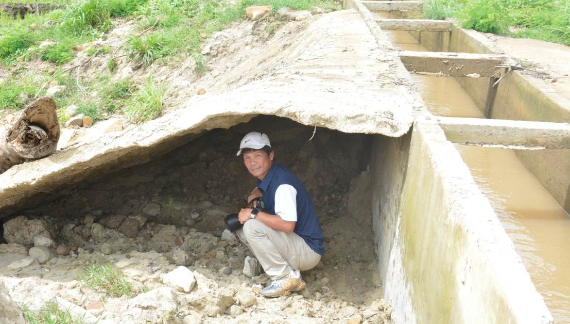 Dọc tuyến kênh N2, chúng tôi ghi nhận nhiều điểm nối giữa ống dẫn nước và kênh máng bê-tông bị hư hỏng. Thậm chí, nhiều điểm kênh đất xung quanh đã bị sụt lún, khiến kênh dẫn nước hẫng cả phần đáy và có thể gãy, đổ bất cứ lúc nào. Tại các điểm sụt lún, hệ thống kè bê-tông xung quanh qua các cống thoát nước cũng chịu chung số phận. Nhiều điểm, sụt lún gây hỗng đất nền xung quanh kênh dẫn mà vài người lớn có thể chui vào lọt. Lo ngại hơn, từ các điểm sụt lún này bộc lộ ra những vấn đề về chất lượng công trình. Tại một điểm kè bê-tông chỉ được “tráng” một lớp mỏng xi-măng, trồi cả đất lên, phần chân móng trơ ra những viên đá sau những trận mưa xói mòn hết lớp bê-tông. Chưa kể, nhiều phần bê-tông khác ở các điểm đấu nối, thanh giằng, nắp đậy kém chất lượng, chỉ dãi dầu nắng mưa chưa được bao lâu đã trơ cả lõi sắt, thép.