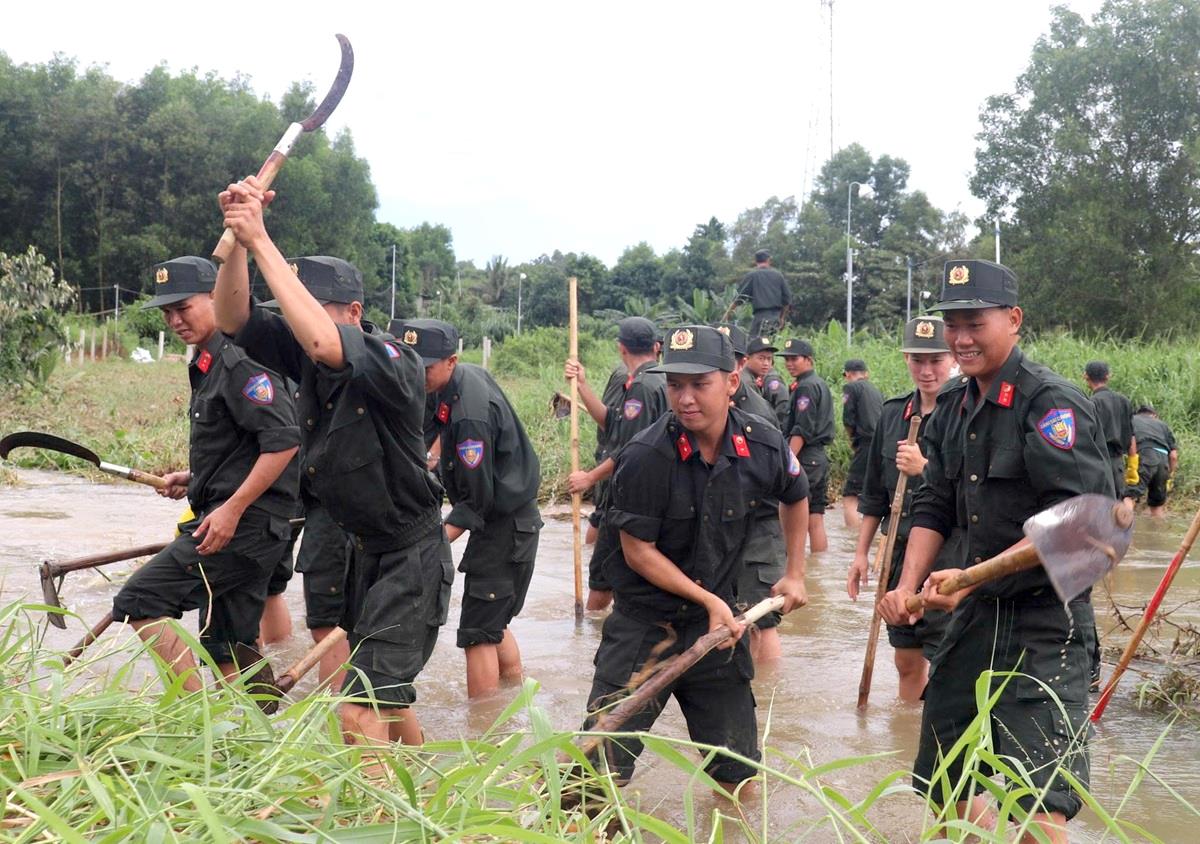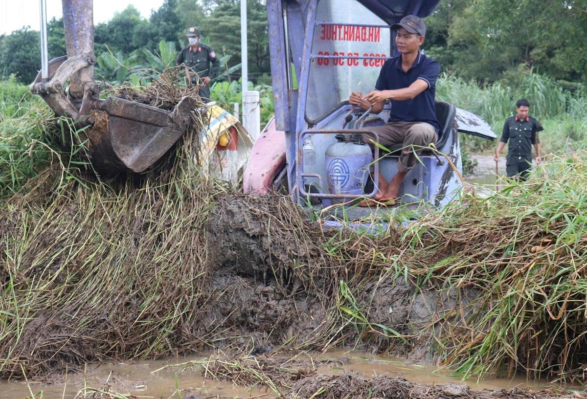 Trước tình hình khó khăn trên, các cán bộ, chiến sỹ Tiểu đoàn 3 - Trung Đoàn CSCĐ Nam Trung Bộ - K02 phối hợp cùng bà con Nhân dân, các lực lượng của địa phương kịp thời khẩn trương triển khai trục vớt khối lượng bèo tảng lớn bị mắc cạn, đồng thời nạo vét, khơi thông các cống thoát nước bị bồi lấp.
