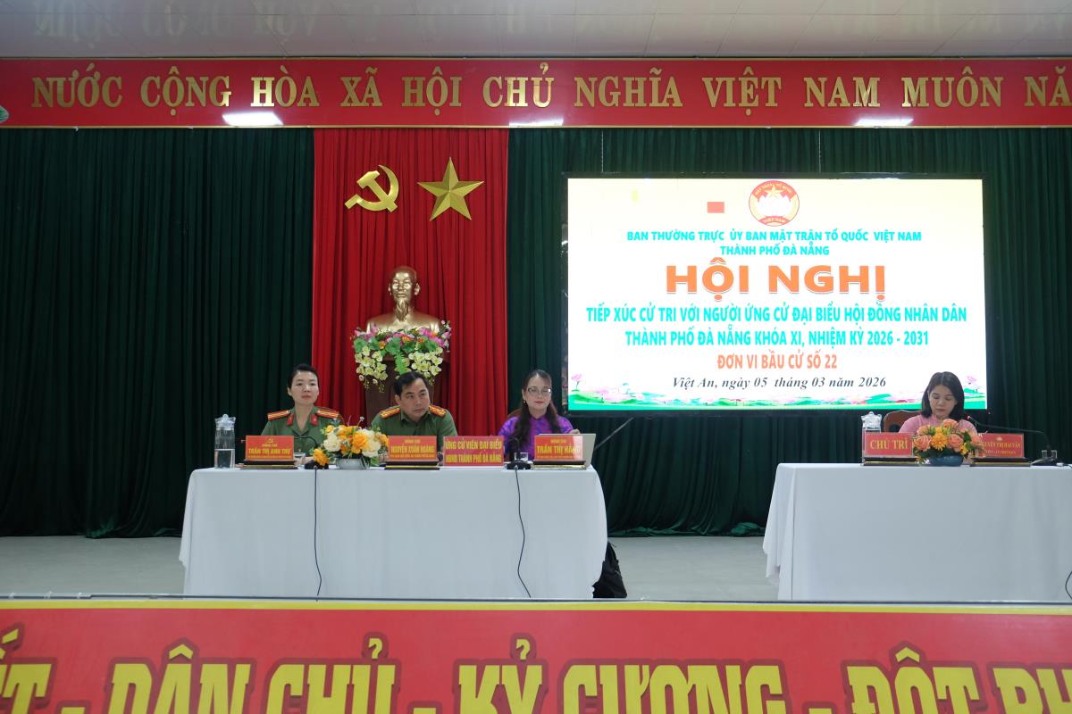 Tại hội nghị, các ứng cử viên gồm bà Trần Thị Hằng – Bí thư Đảng ủy, Chủ tịch HĐND xã Việt An; Đại tá Nguyễn Xuân Hoàng – Phó Giám đốc Công an thành phố Đà Nẵng; Thiếu tá Trần Thị Anh Thư – Phó Trưởng phòng An ninh điều tra Công an thành phố đã lần lượt trình bày tiểu sử tóm tắt và chương trình hành động của mình nếu được cử tri tín nhiệm bầu làm đại biểu HĐND thành phố nhiệm kỳ 2026–2031. Nội dung chương trình hành động của các ứng cử viên tập trung vào những giải pháp phát triển kinh tế - xã hội, cải cách thủ tục hành chính, nâng cao hiệu quả quản lý nhà nước, bảo đảm an ninh trật tự, chăm lo đời sống nhân dân; đồng thời cam kết tăng cường lắng nghe, kịp thời phản ánh những ý kiến, kiến nghị chính đáng của cử tri đến các cơ quan có thẩm quyền.