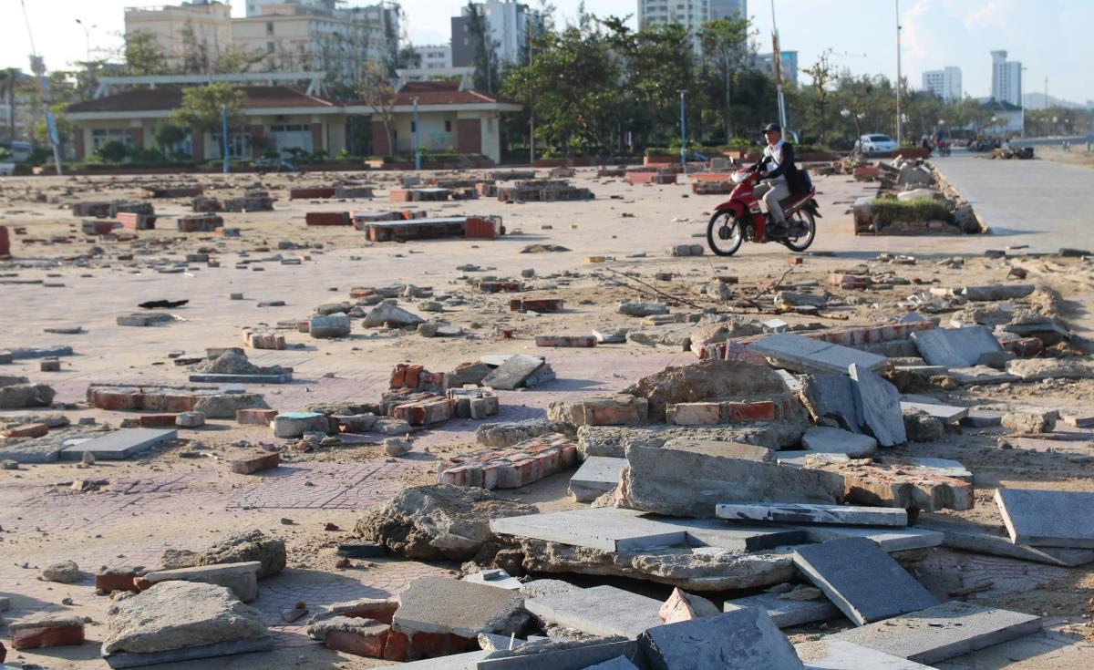 Quảng trường Bình Minh được xem như trái tim du lịch biển Cửa Lò nhưng sau cơn bão số 10 giờ đây chỉ còn lại khung cảnh ngổn ngang, hoang tàn. Hệ thống gạch lát nền tại khu vực đi bộ bị bóc lổm nhổm, nhiều nơi bị sập cả mảng bê-tông lớn, cây cối, rác thải chất ngổn ngang chắn lối đi.