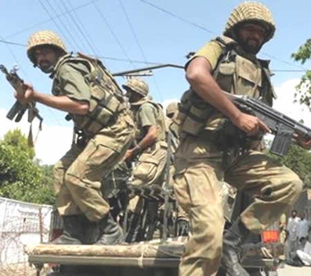 Quân đội Pakistan tuần tra tại Mingora, thị trấn chính của thung lũng Swat. Ảnh: AFP |