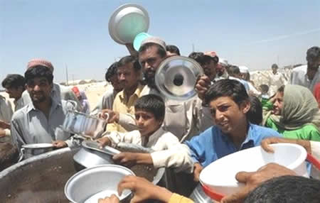 Chờ nhận thức ăn tại trại tị nạn ở Swabi. Ảnh: AFP |
