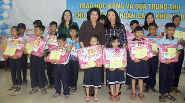 Phó Chủ tịch nước Đặng Thị Ngọc Thịnh trao quà cho các cháu ở Làng trẻ em SOS Huế. |