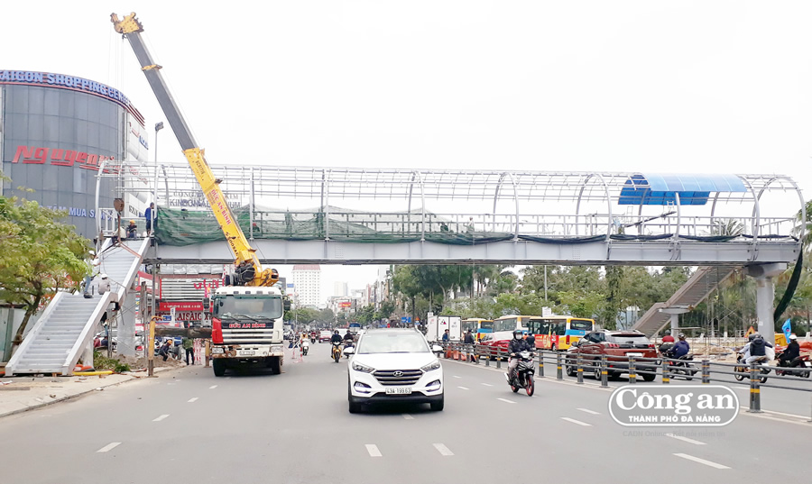 Đại diện đơn vị thi công, ông Đào Quang Huy - Phó Giám đốc Cty CP Xây dựng Xuân Quang, cho hay: Khó khăn lớn nhất khi triển khai công trình cầu đi bộ vượt đường Điện Biên Phủ là thi công trong khu vực gần cửa hầm chui, hàng ngày có mật độ phương tiện ra vào hầm rất lớn. ‘‘Vì vậy, trong quá trình thi công để vừa đảm bảo an toàn công trình vừa đảm bảo giao thông bình thường và ATGT trong khu vực, chúng tôi đã bố trí nhân viên hướng dẫn giao thông, che chắn công trình bằng lưới thép và lưới vải để ngăn không cho thiết bị, dụng vụ, vật liệu... rơi xuống đường. Đặc biệt, đối với công đoạn tập kết nhịp cầu đến chân công trường và thi công lắp dựng nhịp cầu, chúng tôi cho thi công vào ban đêm, phối hợp thêm với lực lượng CSGT Q.Thanh Khê để tổ chức điều tiết giao thông nhằm đảm bảo cho giao thông thông suốt và an toàn’’, ông Huy cho biết thêm.