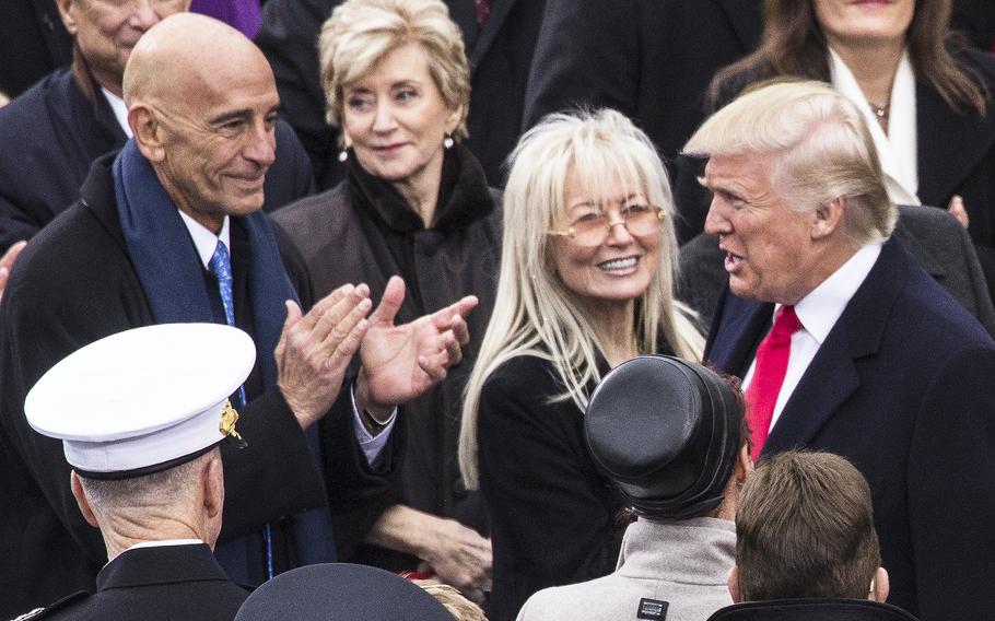 Ông Thomas Barrack (trái) vỗ tay chúc mừng khi ông Donald Trump tuyên thệ nhậm chức Tổng thống tại Điện Capitol vào tháng 1-2017. Ảnh: Stripes |