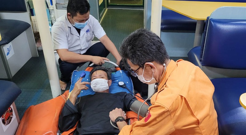 Rạng sáng 15-8, tàu SAR 412 đã tiếp cận được tàu ĐNa 90406 TS triển khai các biện pháp nghiệp vụ, ekip cứu nạn triển khai cấp cứu tại chỗ cho bệnh nhân và đưa lên tàu SAR 412 để chăm sóc y tế, khẩn trương hành trình đưa bệnh nhân về đất liền để điều trị.