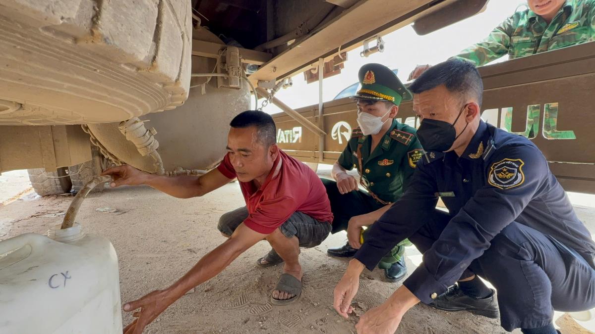 Qua kiểm tra, lực lượng chức năng phát hiện dưới gầm rơ-moóc có một két kim loại hình trụ, đường kính khoảng 0,7m, dài 2,56m, được hàn cố định vào khung xe. Bên trong chứa chất lỏng nghi là dầu Diesel.