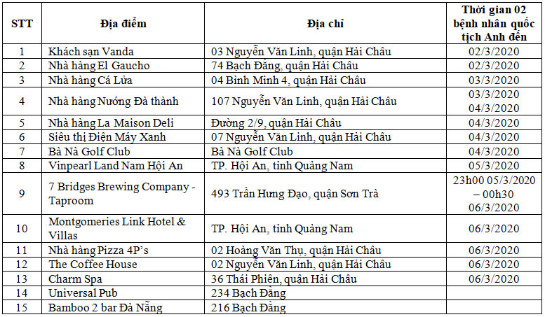 Sở Y tế TP Đà Nẵng cho biết, trong thời gian từ ngày 2/3/2020 – 7/3/2020, theo thông tin ghi nhận được, hai bệnh nhân COVID-19 quốc tịch Anh có quá trình di chuyển tại thành phố Đà Nẵng như sau: