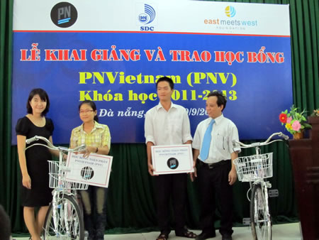 * Chiều cùng ngày, Trung tâm Phát triển phần mềm ĐHĐN phối hợp tổ chức Từ thiện Passarells Numeriques nước CH Pháp (PNVietNam), Tổ chức Đông Tây Hội ngộ tại Đà Nẵng khai giảng và trao học bổng PNVietNam khóa 2 (2011-2013) cho 60 HS có hoàn cảnh khó khăn, hiếu học thuộc các tỉnh miền Trung-Tây Nguyên đang theo học chương trình đào tạo “Chuyên viên quản lý mạng và hệ thống” (Dự án PNV). Đây là dự án liên kết, hợp tác đào tạo giữa PNVietnam, Tổ chức Đông Tây Hội ngộ tại Đà Nẵng và ĐHĐN được triển khai từ năm 2009 với khóa học đầu tiên có 30 SV. Các SV sẽ được nhận học bổng toàn phần, được Dự án lo ăn, ở và hỗ trợ mỗi em một chiếc xe đạp.