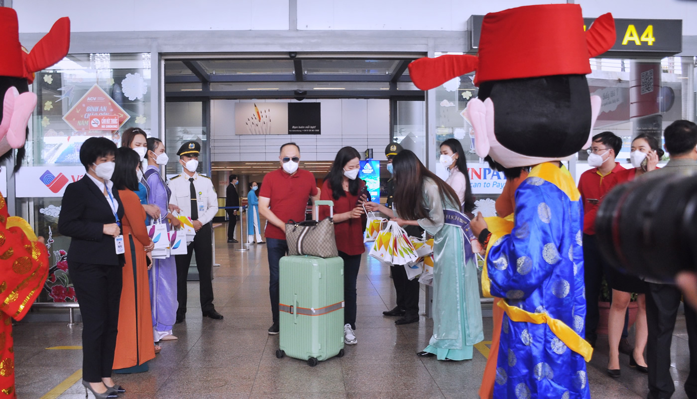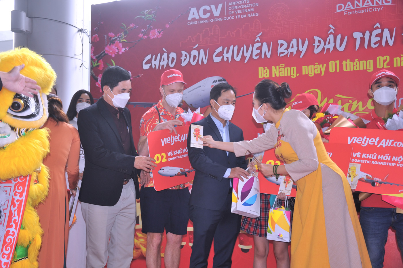 Sáng 1-2 (Mùng 1 Tết), Sở Du lịch thành phố Đà Nẵng phối hợp Hãng hàng không Vietjet Air, Cty CP Truyền thông Rồng Tiên Sa tổ chức đón chuyến bay đầu tiên đến Đà Nẵng dịp đầu năm mới Nhâm Dần 2022.