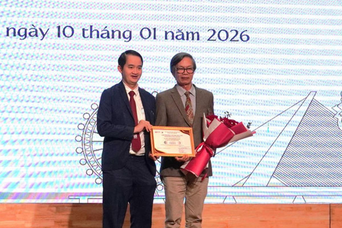 Nhà giáo Ưu tú, Anh hùng lao động Lê Công Cơ - Chủ tịch Hội đồng Đại học Duy Tân (trái) trao giải thưởng Văn học Duy Tân cho tác giả Nguyễn Kim Huy.