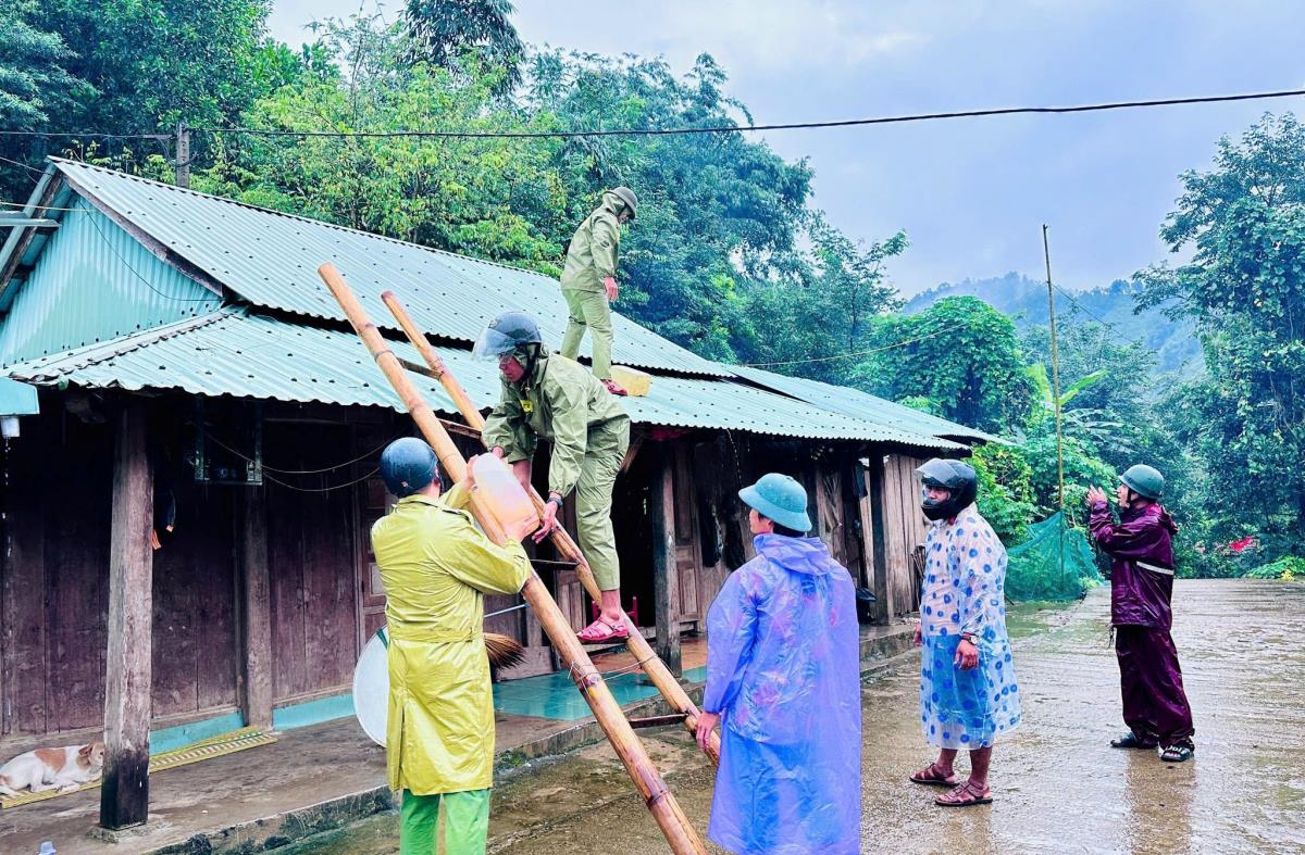 Lực lượng Công an và chính quyền xã A Vương, TP Đà Nẵng hỗ trợ chằng chống nhà cho người dân