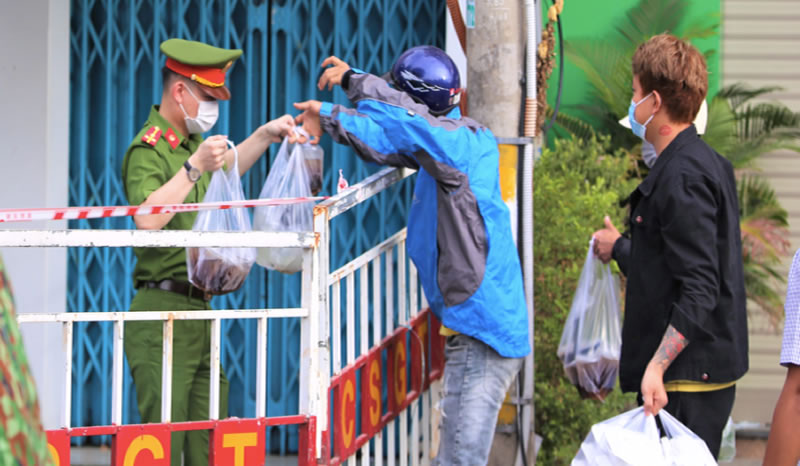 Một nhóm bạn trẻ mang cơm, nước đến tặng các chiến sĩ công an đang làm nhiệm vụ tại khu vực cách ly. |