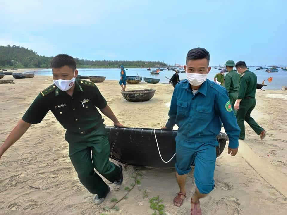 Lực lượng Công an, Quân đội hỗ trợ ngư dân kéo tàu thuyền và chằng chống nhà cửa. |