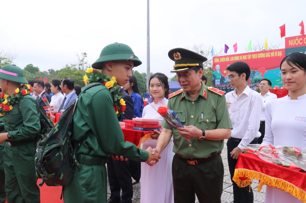 Thiếu tướng Nguyễn Hữu Hợp- Giám đốc Công an TP tặng hoa, quà cho tân binh