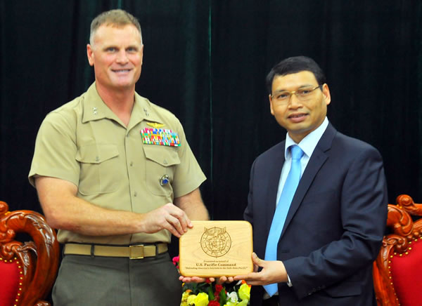 | Thiếu tướng Lục quân Steven Rudder tặng bức tranh bằng gỗ về Bộ Tư lệnh Thái Bình Dương cho Phó Chủ tịch Hồ Kỳ Minh. |