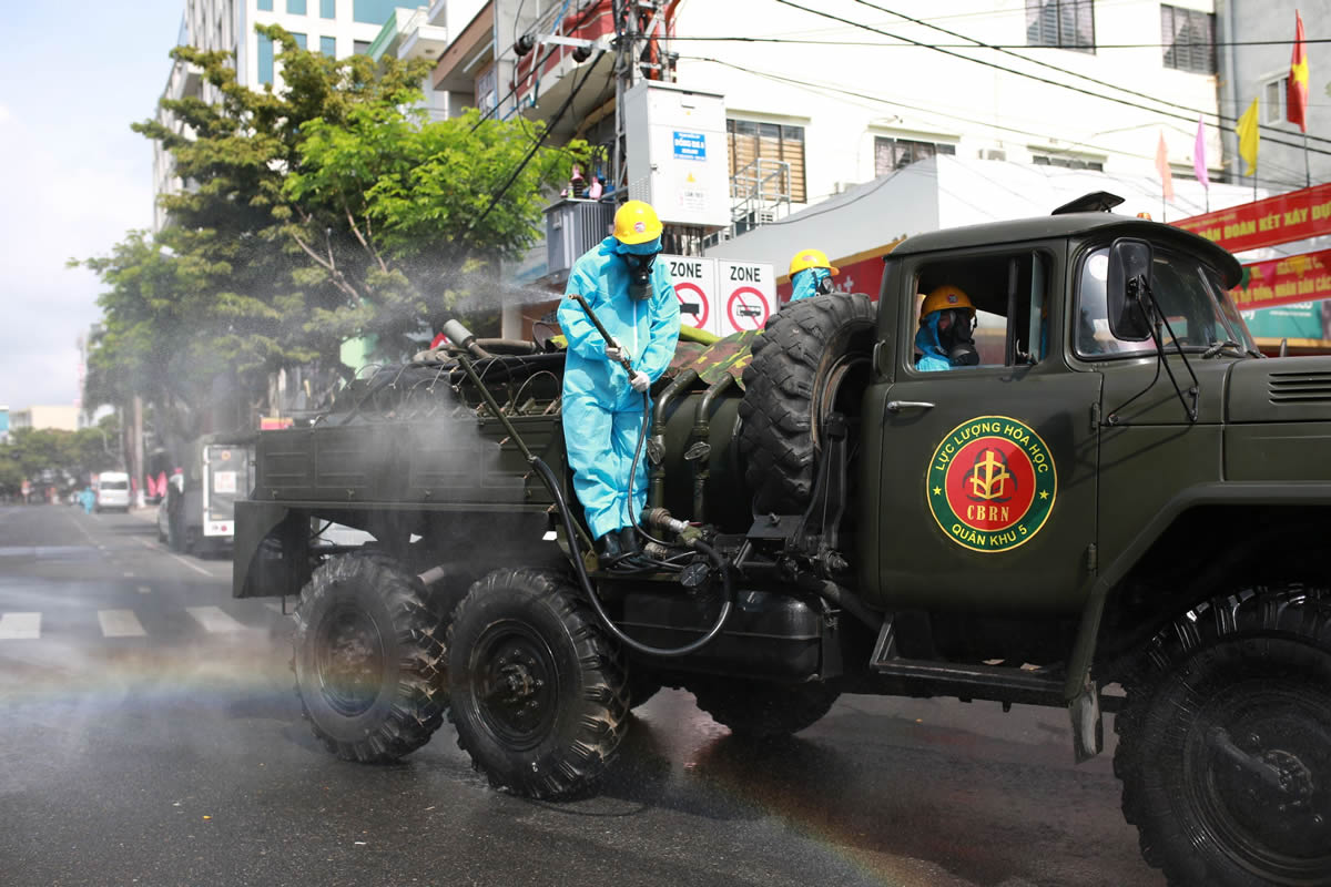 Binh chủng hóa học phun khử khuẩn trục đường Đống Đa, xung quanh bar New Phương Đông. |