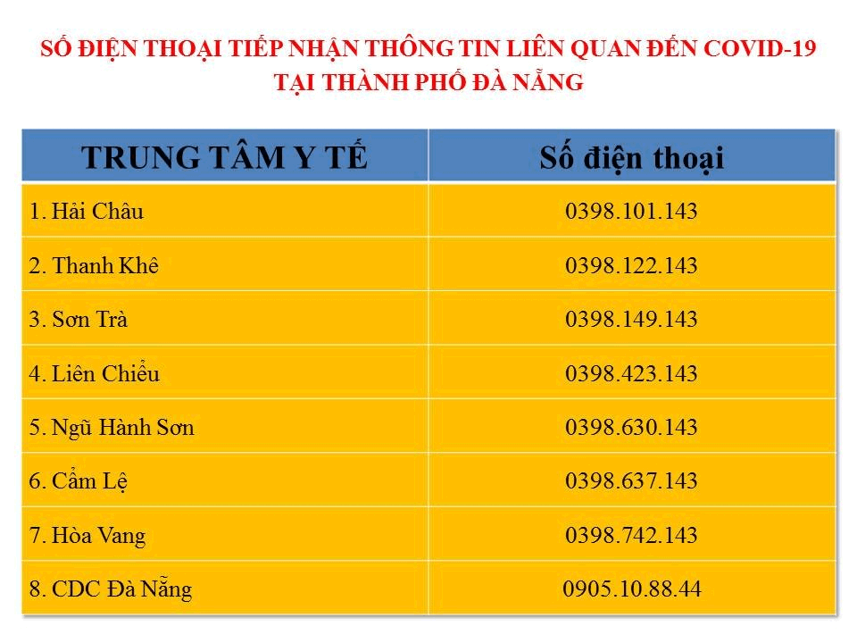 Để phục vụ cho công tác điều tra, truy vết, khoanh vùng và xử lý các thông tin phục vụ cho công tác phòng chống dịch COVID-19, TP Đà Nẵng công bố số điện thoại liên lạc tương ứng với các quận huyện như sau