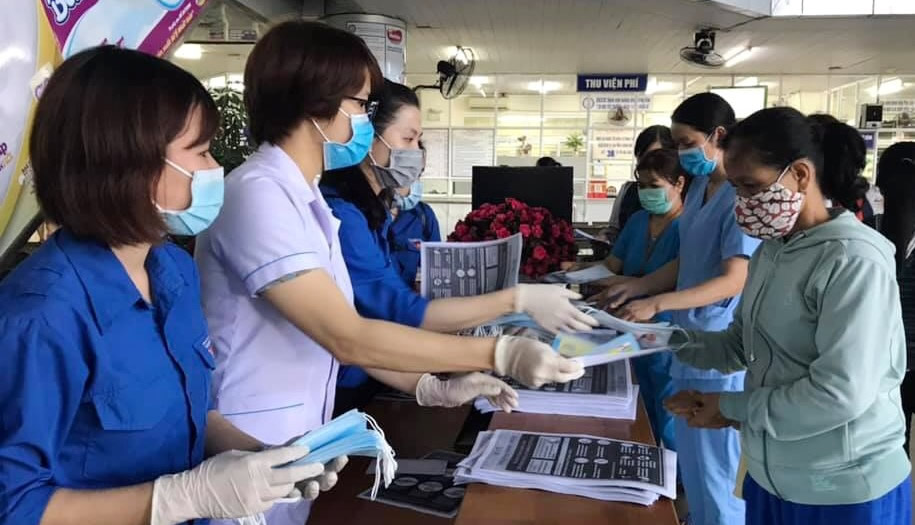 Cán bộ, nhân viên ngành y tế TP Đà Nẵng phát khẩu trang và tờ rơi hướng dẫn phòng chống dịch Covid-19 miễn phí cho người dân. |