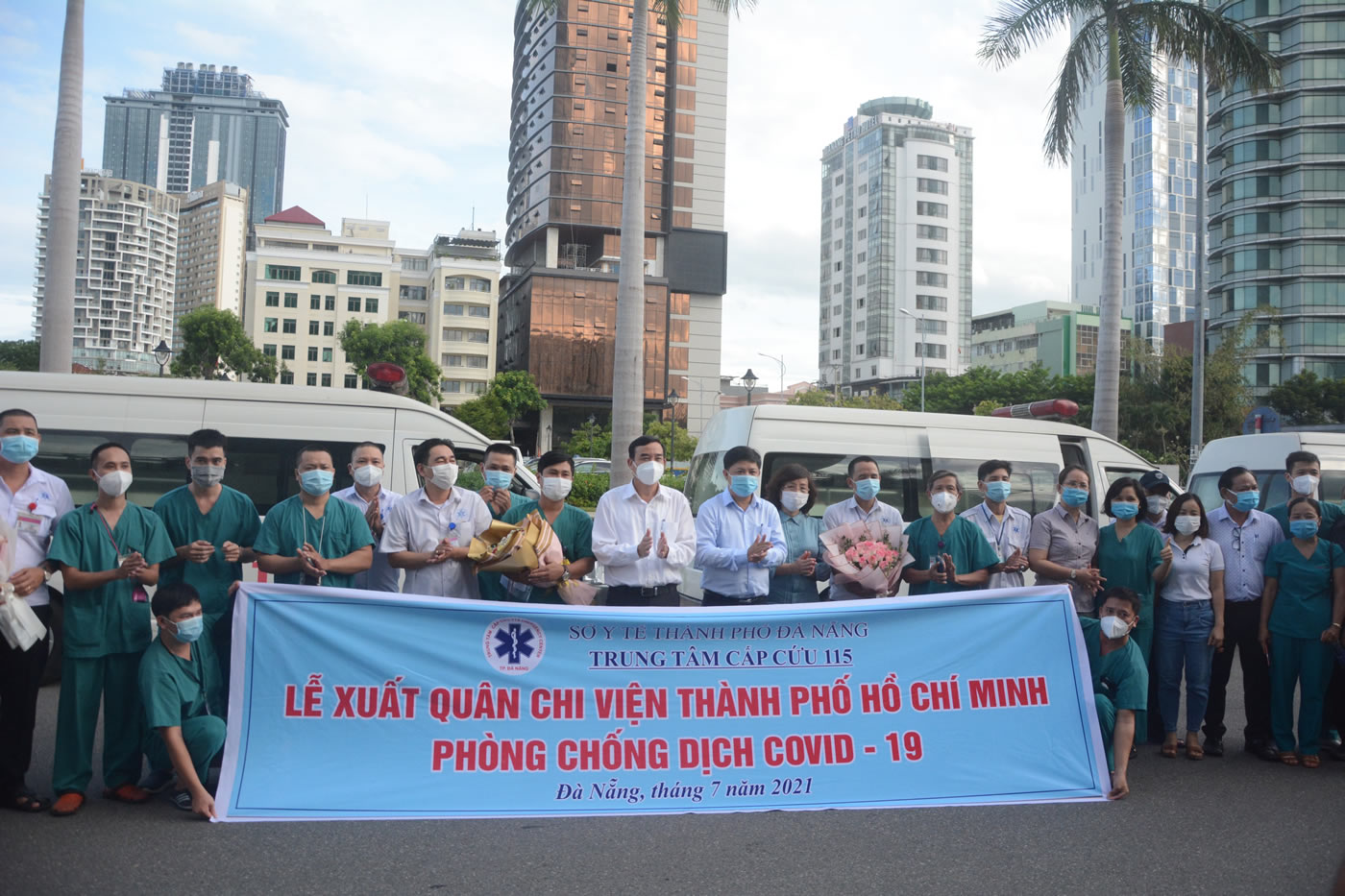 Đà Nẵng cử 15 cán bộ, y bác sỹ và 5 xe cấp cứu chi viện cho TP Hồ Chí Minh Ngày 20-7, lãnh đạo TP đã tổ chức gặp mặt, chia tay Đoàn y, bác sỹ, điều dưỡng của Trung tâm Cấp cứu (115) Đà Nẵng vào chi viện, hỗ trợ cho TP Hồ Chí Minh trong phòng, chống dịch bệnh COVID-19. Đoàn y, bác sỹ, lái xe Trung tâm cấp cứu 115 Đà Nẵng gồm 2 bác sĩ, 5 y sĩ và 8 lái xe cùng 5 xe cấp cứu 115 với đầy đủ trang, thiết bị cấp cứu sẽ cùng đoàn tham gia công tác vận chuyển bệnh nhân F1 theo sự điều phối của ngành y tế TP Hồ Chí Minh. Dự kiến đến 10 giờ ngày 21-7, Đoàn có mặt tại TP Hồ Chí Minh và bắt tay vào thực hiện nhiệm vụ. |