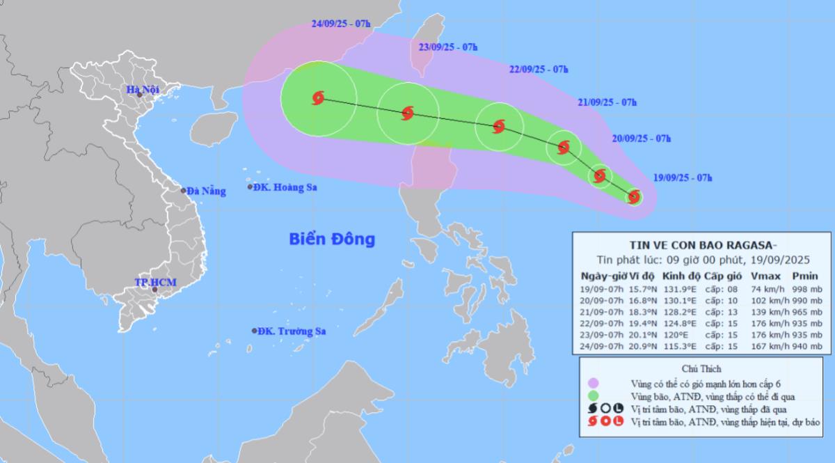 Theo dự báo của Trung tâm dự báo khí tượng thủy văn quốc gia, khoảng tối nay (ngày 22 tháng 9 năm 2025) bão Ragasa sẽ di chuyển vào biển Đông (trở thành cơn bão số 9 trên biển Đông trong năm 2025). Sau khi vào biển Đông bão di chuyển nhanh hơn với tốc độ khoảng 20 km/giờ và duy trì cường độ cực đại cấp 16-17, giật trên cấp 17 trong các ngày 22-23 tháng 9 năm 2025 trên biển Đông, sóng biển cao trên 10m, biển động dữ dội, đặc biệt nguy hiểm cho tàu thuyền hoạt động ở khu vực bắc và giữa biển Đông.