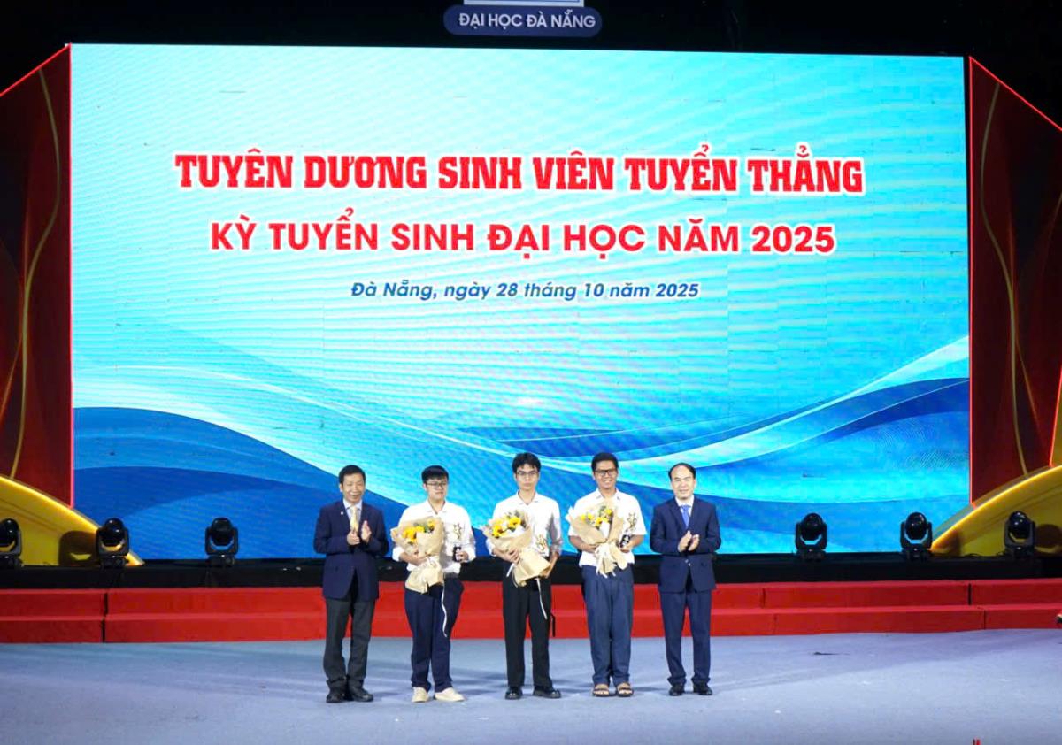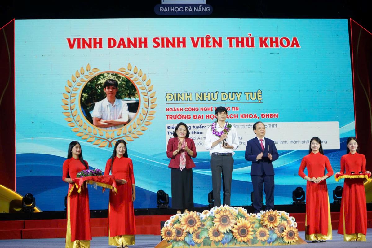 Tại chương trình, ĐH Đà Nẵng vinh danh 9 sinh viên Thủ khoa của 6 trường đại học thành viên và 3 đơn vị đào tạo trực thuộc, mỗi suất khen thưởng trị giá 10 triệu đồng kèm biểu trưng vinh danh. Nhiều Thủ khoa đạt thành tích nổi bật như sinh viên Đinh Như Duy Tuệ - Thủ khoa Trường ĐH Bách khoa, đồng thời là Thủ khoa khối A1 của thành phố Đà Nẵng (IELTS 8.5); sinh viên Lê Khánh Nguyên - Thủ khoa Trường ĐH Sư phạm, đồng thời là Thủ khoa khối C của thành phố; cùng các Thủ khoa của Trường ĐH Kinh tế, ĐH Ngoại ngữ, ĐH Công nghệ thông tin và Truyền thông Việt - Hàn, Viện Nghiên cứu và Đào tạo Việt - Anh đều đạt 30 điểm xét tuyển.